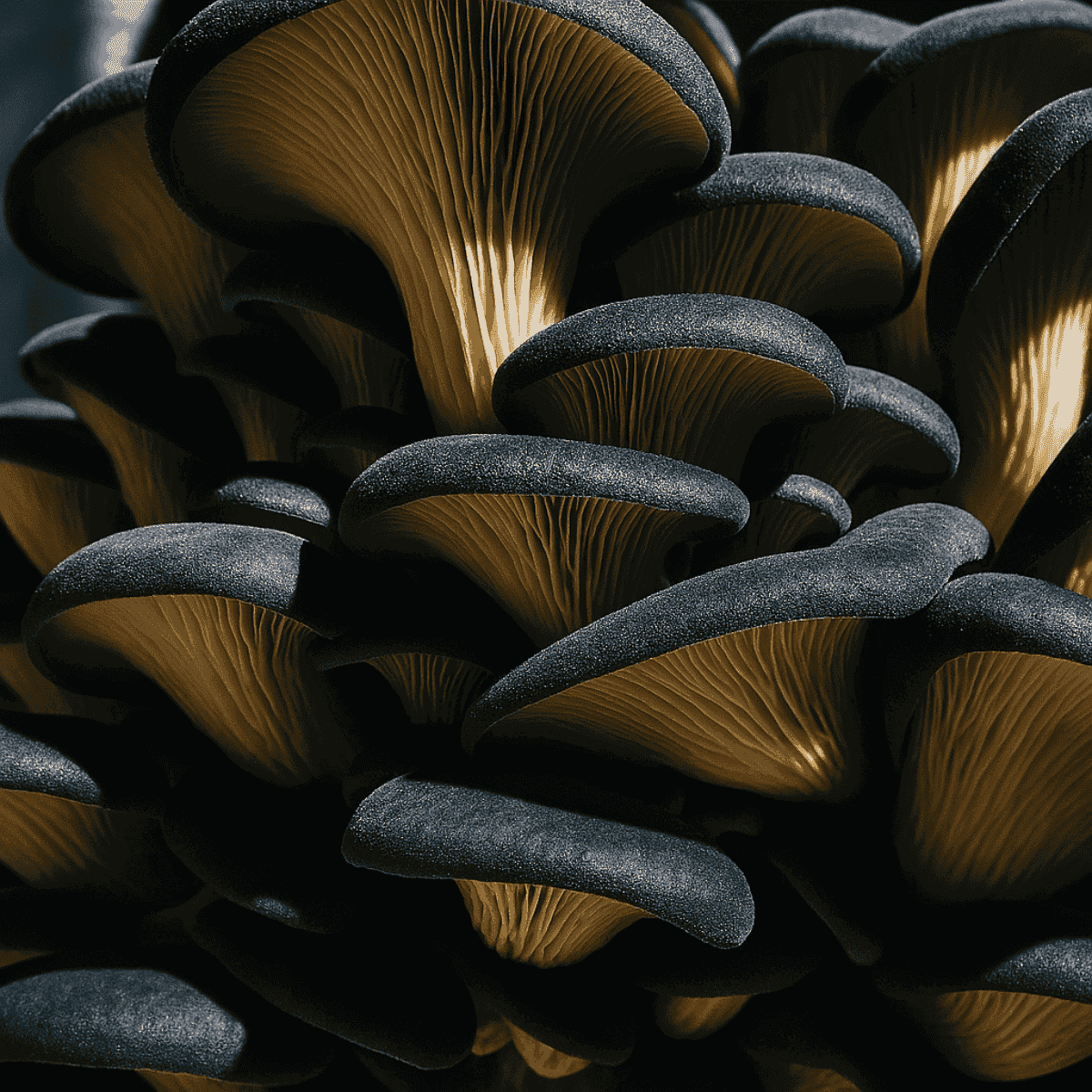 Blue Oyster mushrooms are one of the most common and reliable gourmet species. They grow fast, tolerate cooler temps, and fruit in dense, layered clusters with a blueish-gray cap. Excellent for sautéing or adding depth to broths.